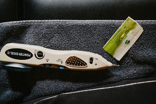 - When using the Pointer Excel II, make sure that the hand on the device is in contact with the two metal plates and that your other hand is touching the skin of the patient. I like to place my thumb and index finger on either side of the needle, touching the skin of the patient.